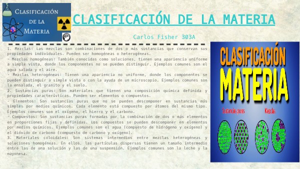 1. Mezclas: Las mezclas son combinaciones de dos o más sustancias que conservan sus propiedades individuales. Pueden ser homogéneas o heterogéneas. - Mezclas homogéneas: También conocidas como soluciones, tienen una apariencia uniforme a simple vista, donde los componentes no se pueden distinguir. Ejemplos comunes son el agua salada y el aire. - Mezclas heterogéneas: Tienen una apariencia no uniforme, donde los componentes se pueden distinguir a simple vista o con la ayuda de un microscopio. Ejemplos comunes son la ensalada, el granito y el suelo. 2. Sustancias puras: Son materiales que tienen una composición química definida y propiedades características. Pueden ser elementos o compuestos. - Elementos: Son sustancias puras que no se pueden descomponer en sustancias más simples por medios químicos. Cada elemento está compuesto por átomos del mismo tipo. Ejemplos comunes son el oxígeno, el hierro y el carbono. - Compuestos: Son sustancias puras formadas por la combinación de dos o más elementos en proporciones fijas y definidas. Los compuestos se pueden descomponer en elementos por medios químicos. Ejemplos comunes son el agua (compuesto de hidrógeno y oxígeno) y el dióxido de carbono (compuesto de carbono y oxígeno). 3. Materiales coloidales: Son sistemas intermedios entre mezclas heterogéneas y soluciones homogéneas. En ellos, las partículas dispersas tienen un tamaño intermedio entre las de una solución y las de una suspensión. Ejemplos comunes son la leche y la mayonesa.