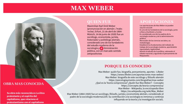 Max Weber: quién fue, biografía, pensamiento, aportes - Lifeder https://www.lifeder.com/aportaciones-max-weber/ Max Weber: biografía de este sociólogo y filósofo alemán https://psicologiaymente.com/biografias/max-weber ¿Qué es la Teoría comprensiva? ¿Quién fue Max Weber? - Concepto https://concepto.de/teoria-comprensiva/ Max Weber - Wikipedia, la enciclopedia libre https://es.wikipedia.org/wiki/Max_Weber Max Weber (1864-1920) fue un sociólogo, filósofo, jurista y economista alemán, considerado el padre de la sociología moderna1234. Su contribución a la sociología es inmensa y continúa influyendo en la teoría y la investigación social1.