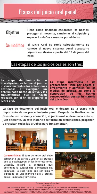 Gutierrez Carrasco Oscar Axel Univer Milenium. Utel Universidad. (5 de 1 de 2022). Conoce las ventajas de los Juicios Orales y sus etapas. Obtenido de https://utel.mx/blog/estudia-en-linea/conoce-las-ventajas-de-los-juicios-orales-y-susetapas/#:~:text=Etapas%20de%20un%20juicio%20oral,juicio%20oral%20o%20%C2%ABdebate%C2%BB.