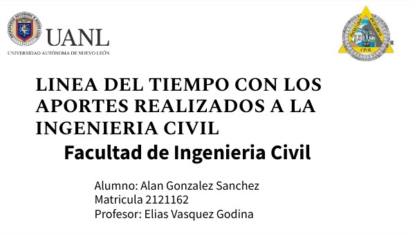 En esta presentacion se abordara el tema de los origenes e inicios de la Ingenieria Civil en nuestra humanidad, tanto las formas en que se invento esta importante rama de la ingenieria, asi como las maneras en que se fue desarrollando a lo largo de la historia, trataremos de profundizar en como se desarrollo esta Ingenieria y los distintos y diversos aportes que ha hecho al planeta y que gracias a ellos se ha logrado tener una calidad de vida muy buena en el mundo.Se organizara una linea del tiempo en la cual se ordenaran los 15 hechos seleccionados para este trabajo de forma cronologica ascendente, y ademas estara acompañada por algunas imagenes para facilitar la comprension de los mismos. En la linea del tiempo a continuacion enumeraremos 15 aportes importantes de la ingenieria civil empezando desde lo mas antiguo a lo mas reciente y se incluiran imagenes de cada aportacion