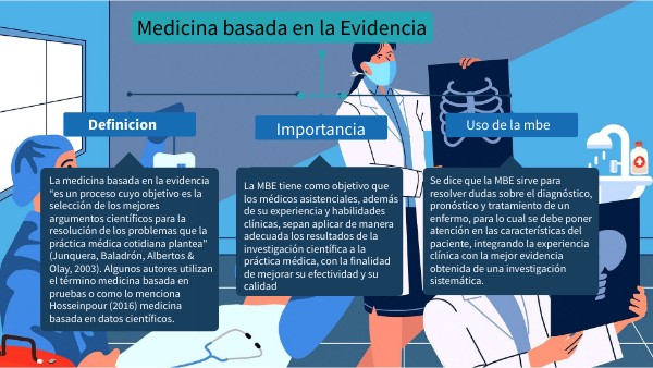Se dice que la MBE sirve para resolver dudas sobre el diagnóstico, pronóstico y tratamiento de un enfermo, para lo cual se debe poner atención en las características del paciente, integrando la experiencia clínica con la mejor evidencia obtenida de una investigación sistemática.