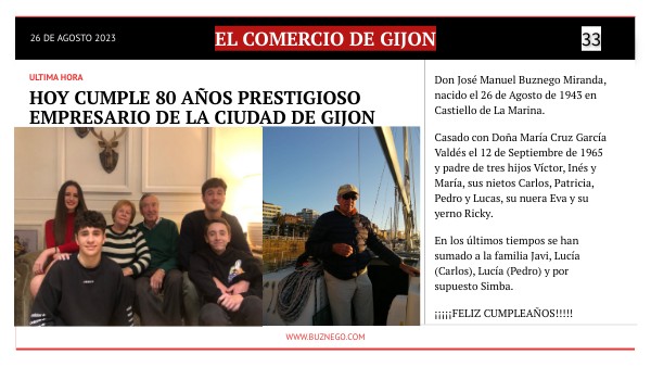 Don José Manuel Buznego Miranda, nacido el 26 de Agosto de 1943 en Castiello de La Marina. Casado con Doña María Cruz García Valdés el 12 de Septiembre de 1965 y padre de tres hijos Víctor, Inés y María, sus nietos Carlos, Patricia, Pedro y Lucas, su nuera Eva y su yerno Ricky. En los últimos tiempos se han sumado a la familia Javi, Lucía (Carlos), Lucía (Pedro) y por supuesto Simba. ¡¡¡¡¡FELIZ CUMPLEAÑOS!!!!!
