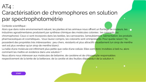 Contexte scientifique : Alors que dans notre environnement naturel, les plantes et les animaux nous offrent un florilège de couleurs, les industries agroalimentaires produisent par synthèse chimique des molécules colorées : les colorants (ou chromophores). Ceux-ci sont incorporés dans les textiles, les carrosseries, l’ameublement, l’alimentation, les produits pharmaceutiques et cosmétiques... Vous l’aurez compris, les colorants sont omniprésents. Pour quelle raison ? Ils possèdent des propriétés très intéressantes : peu chers, résistants et plus attractifs visuellement (un sirop de menthe vert est plus vendeur qu’un sirop de menthe blanc). La taille d’une molécule est infiniment plus petite que celle d’une cellule. Elles sont donc invisibles à l’œil nu, alors comment les mettre en évidence dans une solution ? Nous allons nous intéresser aux molécules de bétanine, de carotène et de chlorophylle responsables respectivement de la teinte de la betterave, de la carotte et des feuilles d’épinards.n de la solution A