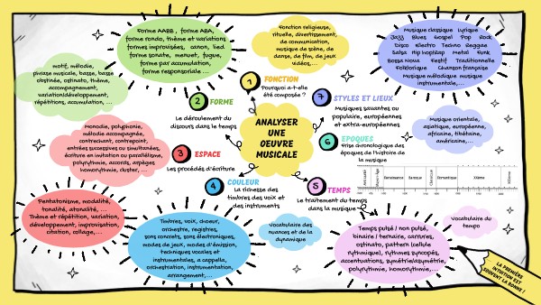 Timbres, voix, choeur,orchestre, registres,sons concrets, sons électroniques, modes de jeux, modes d’émission, techniques vocales et instrumentales, a cappella, orchestration, instrumentation, arrangement,...