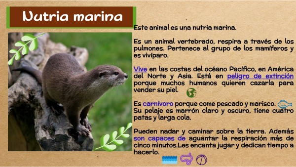 Este animal es una nutria marina. Es un animal vertebrado, respira a través de los pulmones. Pertenece al grupo de los mamíferos y es vivíparo. Vive en las costas del océano Pacífico, en América del Norte y Asia. Está en peligro de extinción porque muchos humanos quieren cazarla para vender su piel. Es carnívoro porque come pescado y marisco. Su pelaje es marrón claro y oscuro, tiene cuatro patas y larga cola. Pueden nadar y caminar sobre la tierra. Además son capaces de aguantar la respiración más de cinco minutos.Les encanta jugar y dedican tiempo a hacerlo.