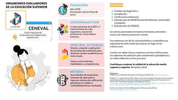 Referencias:CENEVAL. (s.f.). CENEVAL. Recuperado el 23 de agosto de 2023, de https://ceneval.edu.mx/ Reséndiz, J. C. (septiembre de 2014). ¿Quién evalúa a los evaluadores? Avatares de los procesos de acreditación en México. Conferencia: Congreso Internacional de Educación - Evaluación. (U. A. Tlaxcala, Ed.) Tlaxcala. Recuperado el 23 de agosto de 2023, de https://www.academia.edu/34057291/_Qui%C3%A9n_eval%C3%BAa_a_los_evaluadores_Avatares_de_los_procesos_de_acreditaci%C3%B3n_en_M%C3%A9xico Unitips. (s.f.). ¿Qué es el Ceneval? Recuperado el 23 de agosto de 2023, de https://blog.unitips.mx/que-es-el-ceneval