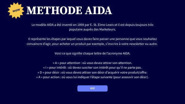Le modèle AIDA a été inventé en 1898 par E. St. Elmo Lewis et il est depuis toujours très populaire auprès des Marketeurs. Il représente les étapes par lequel vous devez faire passer une personne que vous souhaitez convaincre d’agir, pour acheter un produit par exemple, s’inscrire à votre newsletter ou autre. Voici ce que signifie chaque lettre de l’acronyme AIDA. « A » pour attention : où vous devez attirer son attention. « I » pour intérêt : où devez susciter son intérêt pour qu’il ne parte pas. « D » pour désir : où vous devez attiser son désir d’acquérir votre produit/offre. « A » pour action : où vous lui indiquer l’étape suivante (pour assouvir son désir).