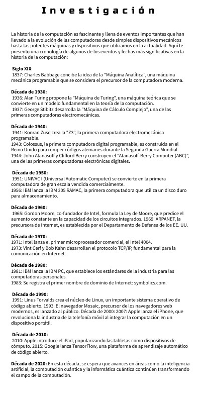 La historia de la computación es fascinante y llena de eventos importantes que han llevado a la evolución de las computadoras desde simples dispositivos mecánicos hasta las potentes máquinas y dispositivos que utilizamos en la actualidad. Aquí te presento una cronología de algunos de los eventos y fechas más significativas en la historia de la computación: Siglo XIX: 1837: Charles Babbage concibe la idea de la "Máquina Analítica", una máquina mecánica programable que se considera el precursor de la computadora moderna. Década de 1930: 1936: Alan Turing propone la "Máquina de Turing", una máquina teórica que se convierte en un modelo fundamental en la teoría de la computación. 1937: George Stibitz desarrolla la "Máquina de Cálculo Complejo", una de las primeras computadoras electromecánicas. Década de 1940: 1941: Konrad Zuse crea la "Z3", la primera computadora electromecánica programable. 1943: Colossus, la primera computadora digital programable, es construida en el Reino Unido para romper códigos alemanes durante la Segunda Guerra Mundial. 1944: John Atanasoff y Clifford Berry construyen el "Atanasoff-Berry Computer (ABC)", una de las primeras computadoras electrónicas digitales. Década de 1950: 1951: UNIVAC I (Universal Automatic Computer) se convierte en la primera computadora de gran escala vendida comercialmente. 1956: IBM lanza la IBM 305 RAMAC, la primera computadora que utiliza un disco duro para almacenamiento. Década de 1960: 1965: Gordon Moore, co-fundador de Intel, formula la Ley de Moore, que predice el aumento constante en la capacidad de los circuitos integrados. 1969: ARPANET, la precursora de Internet, es establecida por el Departamento de Defensa de los EE. UU. Década de 1970: 1971: Intel lanza el primer microprocesador comercial, el Intel 4004. 1973: Vint Cerf y Bob Kahn desarrollan el protocolo TCP/IP, fundamental para la comunicación en Internet. Década de 1980: 1981: IBM lanza la IBM PC, que establece los estándares de la industria para las computadoras personales. 1983: Se registra el primer nombre de dominio de Internet: symbolics.com. Década de 1990: 1991: Linus Torvalds crea el núcleo de Linux, un importante sistema operativo de código abierto. 1993: El navegador Mosaic, precursor de los navegadores web modernos, es lanzado al público. Década de 2000: 2007: Apple lanza el iPhone, que revoluciona la industria de la telefonía móvil al integrar la computación en un dispositivo portátil. Década de 2010: 2010: Apple introduce el iPad, popularizando las tabletas como dispositivos de cómputo. 2015: Google lanza TensorFlow, una plataforma de aprendizaje automático de código abierto. Década de 2020: En esta década, se espera que avances en áreas como la inteligencia artificial, la computación cuántica y la informática cuántica continúen transformando el campo de la computación.
