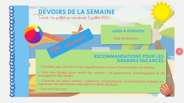 revoir tous les mots de la dictée / lire Minou Bonbon / lire Motordu 1 chap par jour / revoir les tables de multiplication et les verbes au présent et au futur / apporter une boite à chaussures