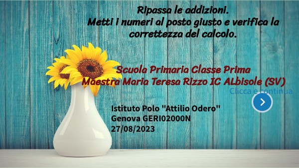 Ripassa le addizioni. Metti i numeri al posto giusto e verifica la correttezza del calcolo. Scuola Primaria Classe Prima Maestra Maria Teresa Rizzo IC ALbisole (SV)