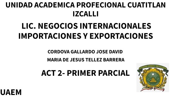 -Montes, J. (2023). Exportación - Definición, qué es y concepto | Economipedia. Economipedia. https://economipedia.com/definiciones/exportacion.html -Administrator. (2023). El proceso operativo de exportación. Midagri.gob.pe. https://www.midagri.gob.pe/portal/185-exportaciones/como-exportar/528-el-proceso-operativo-de-exportacion de, C. (2020, August 6). Política comercial. Wikipedia.org; Wikimedia Foundation, Inc. https://es.wikipedia.org/wiki/Pol%C3%ADtica_comercial#:~:text=La%20pol%C3%ADtica%20comercial%2C%20pol%C3%ADtica%20de,de%20ese%20pa%C3%ADs%20a%20otros. -Trujillo, R. (n.d.). Politica Comercial. https://digitk.areandina.edu.co/bitstream/handle/areandina/1376/Politica%20Comercial.pdf?sequence=1&isAllowed=y Política comercial de México en el siglo XXI. (2018). Política Comercial de México En El Siglo XXI. https://imco.org.mx/politica-comercial-mexico-siglo-xxi/ -Política Comercial Internacional libro blanco. (n.d.). https://www.economia.gob.mx/files/gobmx/librosblancos/Libro%20Blanco%20Pol%C3%ADtica%20Comercial%20Internacional%202013-2018_Sin%20Anexos.pdf -POLITICAS DE COMERCIO INTERNACIONAL. (2014). Slideplayer.es. https://slideplayer.es/slide/10296452/ -Reyna, S. (2021, August 20). Leyes y decretos que regulan el comercio exterior. Garciayasociados.net. https://www.garciayasociados.net/leyes-y-decretos-que-regulan-el-comercio-exterior -Reyna, S. (2021, August 20). Leyes y decretos que regulan el comercio exterior. Garciayasociados.net. https://www.garciayasociados.net/leyes-y-decretos-que-regulan-el-comercio-exterior -Normas y certificaciones para mercados internacionales. (2018). Logycom.mx. https://www.logycom.mx/blog/normas-certificaciones-mercados-internacionales -(2020). Fao.org. https://www.fao.org/3/y5673s/y5673s0n.htm -Qué es la Ley Aduanera | Para qué sirve y cuáles son sus objetivos. (2022). Dripcapital.com. https://www.dripcapital.com/es-mx/recursos/blog/que-es-la-ley-aduanera -ley comercio interior. (2022). VLex. https://vlex.com.mx/tags/ley-comercio-interior-630701/page/2 -Ley Aduanera. (2021). Diputados.gob.mx. https://www.diputados.gob.mx/LeyesBiblio/ref/ladua.htm -Ley Aduanera. (2023, May 25). Justia. https://mexico.justia.com/federales/leyes/ley-aduanera/ -De Diputados, C., Congreso De, D., & Unión, L. (1991). LEY DEL IMPUESTO AL VALOR AGREGADO. https://www.diputados.gob.mx/LeyesBiblio/pdf/LIVA.pdf -(2020). Snice.gob.mx. https://www.snice.gob.mx/cs/avi/snice/ligie.info22.html -LIGIE. (2022, August 17). Facturama Blog - Actualidad En Información Contable Y Fiscal. https://facturama.mx/blog/que-significa/ligie-ley-de-impuestos-generales/ -De Diputados, C., Congreso De, D., & Unión, L. (1997). LEY FEDERAL DEL IMPUESTO SOBRE AUTOMÓVILES NUEVOS. https://www.diputados.gob.mx/LeyesBiblio/pdf/LFISAN.pdf -Ley Federal del Impuesto Sobre Automóviles Nuevos. (2023, May 25). Justia. https://mexico.justia.com/federales/leyes/ley-federal-del-impuesto-sobre-automoviles-nuevos/