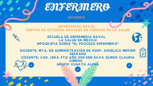 UNIVERSIDAD NAVAL CENTRO DE ESTUDIOS NAVALES EN CIENCIAS DE LA SALUD ESCUELA DE ENFERMERIA NAVAL LA SALUD EN MÉXICO INFOGRÁFIA SOBRE "EL PROCESO ENFERMERO" DOCENTE: MTA. EN ADMINISTRACIÓN DE HOSP. ANGELICA MERINO SERRANO CISCENTE: CAD. 1ERA 4TO AÑO SSN EEN SILVA OLMOS CLAUDIA XIMENA GRUPO: CUARTO ALPHA