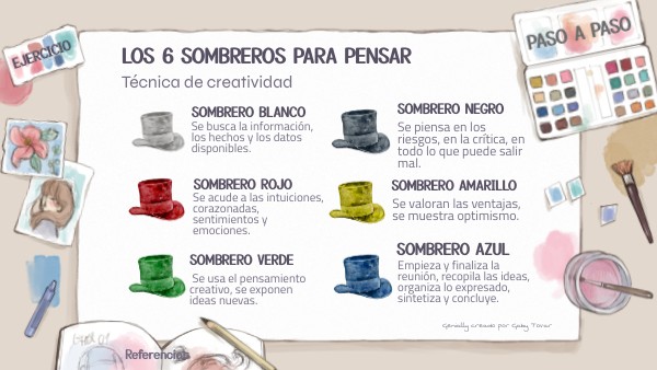 - Seoane, M. S. (2020). Los seis sombreros para pensar | designthinking.gal. designthinking.gal | Consultora De Innovación Y Formación | Design Thinking En España. https://designthinking.gal/tecnicas-de-creatividad-los-seis-sombreros-para-pensar/