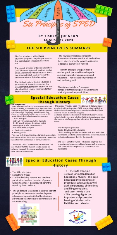 The third principle cases- Daniel RR v Board Of education - This case hilighted the importance of less restricitve classroom. Students with disabilities should be placed in inclusion classroom that fits their needs 2nd case - Schaffer V West - This case hilighted the importance of parents and teachers as well as ensuring that the students are placed in a less restrictive classroom.