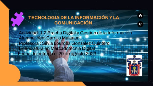 Actividad: 1.2 Brecha Digital y Gestion de la Información Alumna: Yeni Carrillo Malagon Profesora : Silvia Lourdes González Quintero Licenciatura en Mercadotecnia Digital Fecha de entrega el 29 de agosto 2023
