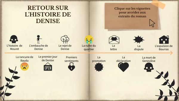 "Mme Aurélie lui garda une sourde rancune ; elle l'avait vue rire avec Pauline, elle crut à des commérages sur les amours de son fils. Alors, dans le rayon, elle isola la jeune fille davantage encore. Depuis longtemps, elle projetait d'emmener ces demoiselles passer un dimanche auprès de Rambouillet, aux Rigolles, où elle avait acheté une propriété, sur ses cent premiers mille francs d'économie ; et, tout d'un coup, elle se décida, c'était une façon de punir Denise, de la mettre ouvertement à l'écart. Seule, cette dernière ne fut pas invitée. Quinze jours à l'avance, le rayon ne causa que de la partie : on se promettait tous les plaisirs. Et rien que des femmes, ce qui était plus amusant. [...] Cependant, le bienheureux jour approchait, ces demoiselles racontaient les préparatifs de toilette, comme si elles partaient pour un voyage de six mois ; tandis que Denise devait les entendre, pâle et silencieuse dans son abandon."