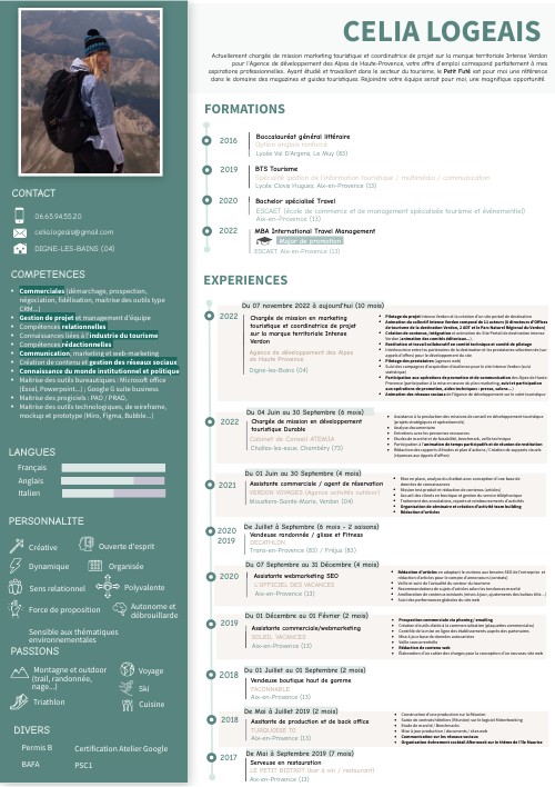 Actuellement chargée de mission marketing touristique et coordinatrice de projet sur la marque territoriale Intense Verdon pour l'Agence de développement des Alpes de Haute-Provence, votre offre d'emploi correspond parfaitement à mes aspirations professionnelles.. Ayant étudié et travaillant dans le secteur du tourisme, le Petit Futé est pour moi une référence dans le domaine des magazines et guides touristiques. Rejoindre votre équipe serait pour moi, une magnifique opportunité.