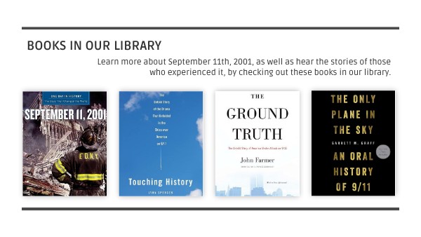 Learn more about September 11th, 2001, as well as hear the stories of those who experienced it, by checking out these books in our library.