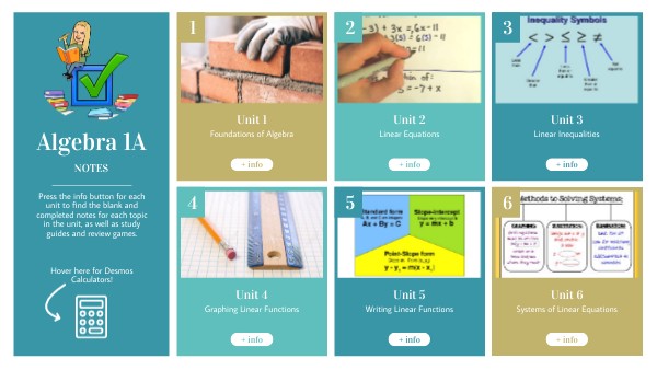 Press the info button for each unit to find the blank and completed notes for each topic in the unit, as well as study guides and review games. Hover here for Desmos Calculators!