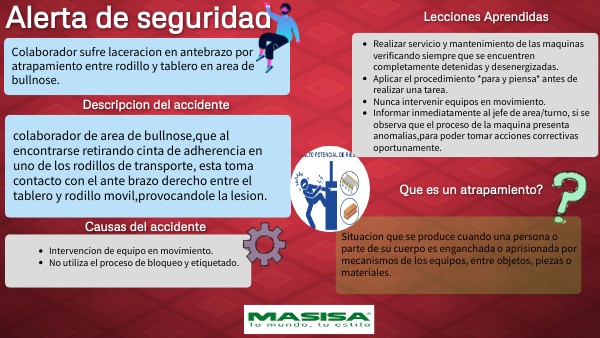 Colaborador sufre laceracion en antebrazo por atrapamiento entre rodillo y tablero en area de bullnose.