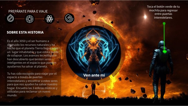 Estimado viajero deberás entender el proceso operativo para poder completar cada una de las misiones a las que te enfrentarás. Este viaje stá dividido en varias misiones. Cuando estes listos y hayas conocido todo el proceso operativo toca la imagen de la TRESERRES, la inteligencia artificial que te dará acceso a las puertas interestelares el conocimiento. Para comunicarte con la inteligencia Tutora puedes utilizar el canal de comunicación ( )interestelar que se encuentra en esta pantalla anterior.