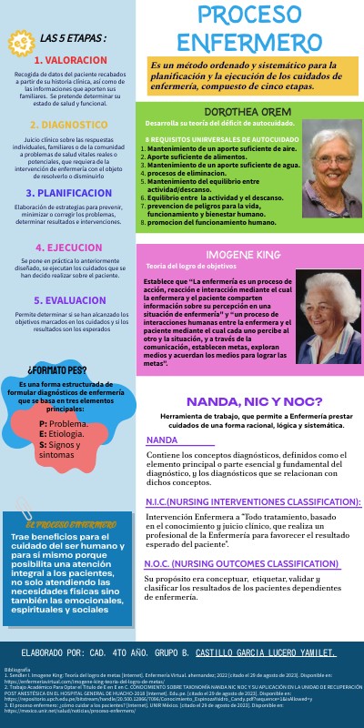 Bibliografía 1. Sendler I. Imogene King: Teoría del logro de metas [Internet]. Enfermería Virtual. ahernandez; 2022 [citado el 29 de agosto de 2023]. Disponible en: https://enfermeriavirtual.com/imogene-king-teoria-del-logro-de-metas/ 2. Trabajo Académico Para Optar el Titulo de E en E en C. CONOCIMIENTO SOBRE TAXONOMÍA NANDA NIC NOC Y SU APLICACIÓN EN LA UNIDAD DE RECUPERACIÓN POST ANESTÉSICA EN EL HOSPITAL GENERAL DE HUACHO-2018 [Internet]. Edu.pe. [citado el 29 de agosto de 2023]. Disponible en: https://repositorio.upch.edu.pe/bitstream/handle/20.500.12866/7096/Conocimiento_EspinozaYsidro_Candy.pdf?sequence=1&isAllowed=y 3. El proceso enfermero: ¿cómo cuidar a los pacientes? [Internet]. UNIR México. [citado el 29 de agosto de 2023]. Disponible en: https://mexico.unir.net/salud/noticias/proceso-enfermero/