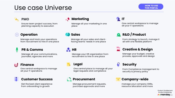 In this portal, you will find examples of use cases that can be managed on monday.com. Each use case has a short video that you can watch and learn. For more questions, please reach out to your point of contact.