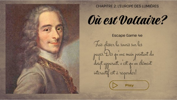 Parcours la pièce avec ta souris. Repère les éléments intéractifs et trouve les indices qui te mèneront à Voltaire.