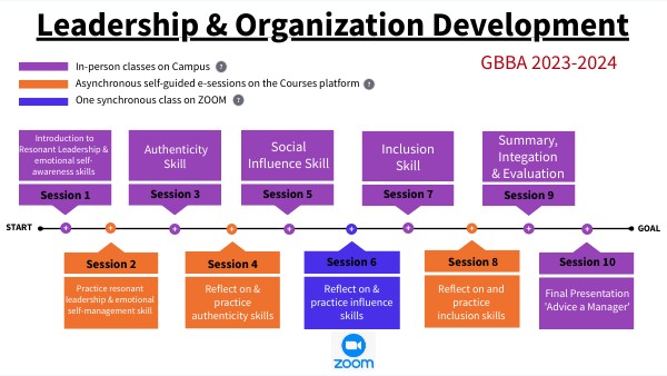 Professors have prepared exercises for students on the Courses platform. You have to watch videos, recap the skills discussed in class, and fill in self-assessments to evaluate your current level of competence. You will need the self-assessments for your final exam (i.e., the Leadership Development Plan). Professors give students an extended slot of three days to work on these e-sessions to make sure that each student will be able to complete these assessments.