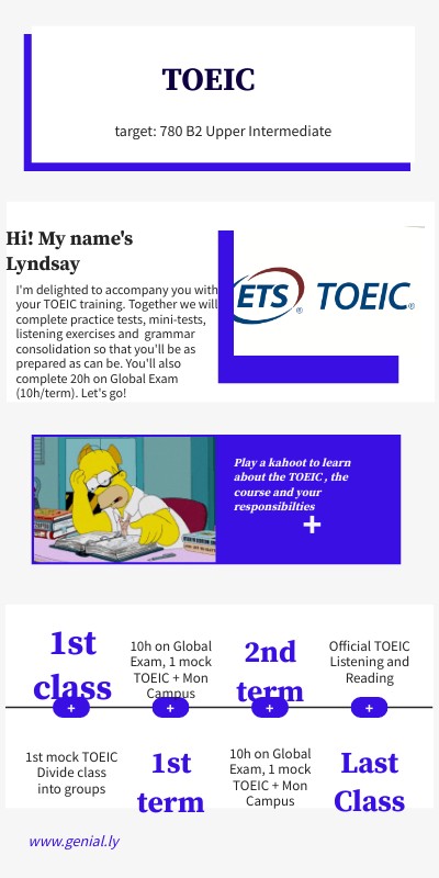 I'm delighted to accompany you with your TOEIC training. Together we will complete practice tests, mini-tests, listening exercises and grammar consolidation so that you'll be as prepared as can be. You'll also complete 20h on Global Exam (10h/term). Let's go!