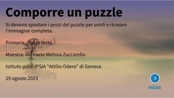 Si devono spostare i pezzi del puzzle per unirli e ricreare l'immagine completa. Primaria, classe terza Maestra: Michaela Melissa Zuccarello Istituto polo: IPSIA "Attilio Odero" di Genova 29 agosto 2023