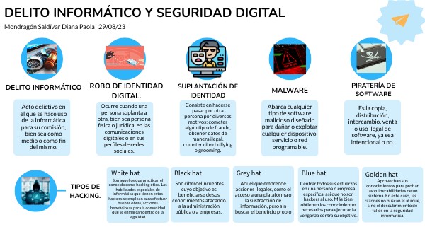 https://www.ertzaintza.euskadi.eus/lfr/web/ertzaintza/que-es-el-delito-informatico#:~:text=El%20delito%20inform%C3%A1tico%20se%20define,o%20como%20fin%20del%20mismo.https://www.unir.net/derecho/revista/robo-identidad-digital/#:~:text=El%20robo%20de%20la%20identidad%20digital%20ocurre%20cuando%20una%20persona,acciones%20que%20realice%20el%20suplantador. https://protecciondatos-lopd.com/empresas/suplantacion-de-identidad/ https://www.mcafee.com/es-mx/antivirus/malware.html https://cpl.thalesgroup.com/es/software-monetization/how-to-prevent-software-piracy#:~:text=La%20pirater%C3%ADa%20de%20software%20es,ya%20sea%20intencional%20o%20no. https://www.arrobasolutions.com/tipos-hackers-caracteristicas/