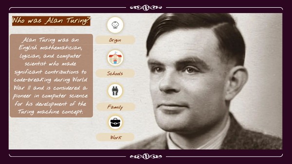 Alan Turing was a groundbreaking mathematician and computer scientist known for his pivotal role in World War II code-breaking efforts, particularly designing the Enigma machine's decryption methods. His concept of the Turing machine laid the foundation for modern computing theory, influencing the development of computers and artificial intelligence. Despite his tragic early death, Turing's legacy continues to shape the fields of computer science and cryptography.