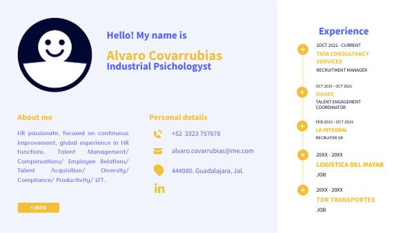 HR passionate, focused on continuous improvement, global experience in HR functions. Talent Management/ Compensations/ Employee Relations/ Talent Acquisition/ Diversity/ Compliance/ Productivity/ LFT.