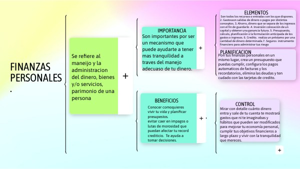Son todos los recursos o entradas con los que dispones. 2. Gastosson salidas de dinero o pagos por distintos conceptos. 3. Ahorro, dinero que se separa de los ingresos con el fin de guardarlo .4. Inversión colocación de un capital y obtener una ganancia futura. 5. Presupuesto, cálculo, planificación o la formulación anticipada de los gastos o ingresos. 6. Credito. realiza un préstamo por una cantidad de dinero determinada.7. Seguros instrumento financiero para administrar tus riesgo