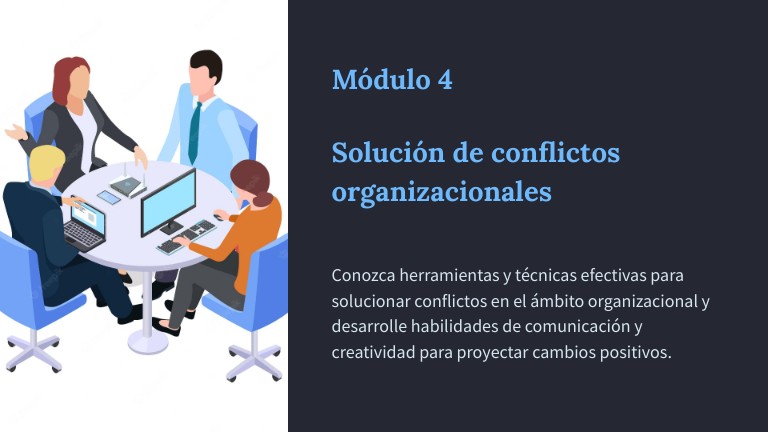 Conoce herramientas y técnicas efectivas para solucionar conflictos en el ámbito organizacional y desarrolla habilidades de comunicación y creatividad para proyectar cambios positivos.