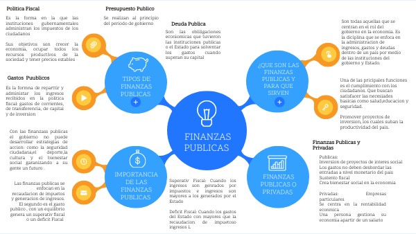 Las finanzas publicas se enfocan en la recaudacion de impuetos y generacion de ingresos. El segundo es el gasto publico , con un equilibrio genera un superativ fiscal o un deficit Fiscal