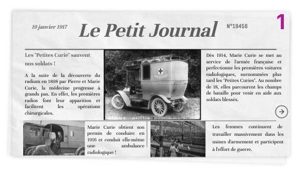Dès 1914, Marie Curie se met au service de l'armée française et perfectionne les premières voitures radiologiques, surnommées plus tard les "Petites Curies". Au nombre de 18, elles parcourent les champs de bataille pour venir en aide aux soldats blessés.