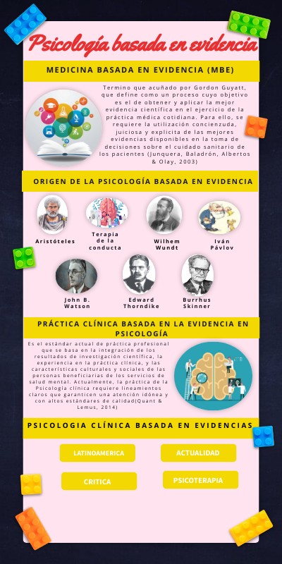 Cuevas, P., Talallero, P., Villarreal, A. & Ayala, M. (2017). Psicoterapia basada en la evidencia. Situación actual. Neurología, Neurocirugía y Psiquiatría, 45 (1), 32-38. https://www.medigraphic.com/pdfs/revneuneupsi/nnp-2017/nnp171g.pdf Echeburúa, E., Salaberria, K., Corral, P. & Polo, R. (2010). Terapias Psicológicas Basadas en la Evidencia: Limitaciones y retos de futuro. Revista Argentina de Clínica Psicológica,19 (3), 247-256. https://www.redalyc.org/pdf/2819/281921798006.pdf Junquera, L., Baladrón, J., Albertos, J. & Olay, S. (2003). Medicina basada en la evidencia (MBE). Ventajas. Revista Española de Cirugía Oral y Maxilofacial, 25 (5) 265-272. https://scielo.isciii.es/scielo.php?script=sci_arttext&pid=S1130-05582003000500003&lng=es&tlng=es. Martínez, A. (2014). Prácticas psicológicas basadas en la evidencia: beneficios y retos para Latinoamérica. Revista costarricense de Psicología, 33 (2), 63-78. https://www.redalyc.org/pdf/4767/476747238009.pdf Quant, D. &Trujillo, S. (2014). Psicología clínica basada en la evidencia y su impacto en la formación profesional, la investigación y la práctica clínica. Revista costarricense de Psicología, 33 (2), 123-136. https://www.redalyc.org/articulo.oa?id=476747238005 UVEG Académico (24 feb. 2022). De la medicina a la psicología. [video]. YouTube. https://youtu.be/ki17yjjzajI?si=2LRv3ps9aMFX96t- Valle, M. (s.f.). Explorando la psicología basada en evidencia. Psicología basada en evidencia. [módulo en línea]. Universidad Virtual del Estado de Guanajuato. https://avalicmod19c.uveg.edu.mx/mod/page/view.php?id=7274