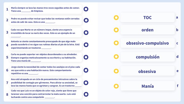 Ana está atrapada en un ciclo de pensamientos intrusivos sobre la posibilidad de contagio por gérmenes. Para aliviar su ansiedad, se lava las manos hasta que se agrietan y sangran. Es un trastorno _____.