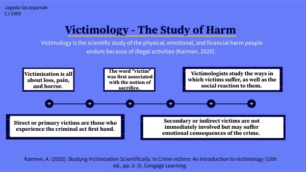 Victimology is the scientific study of the physical, emotional, and financial harm people endure because of illegal activities (Karmen, 2020).