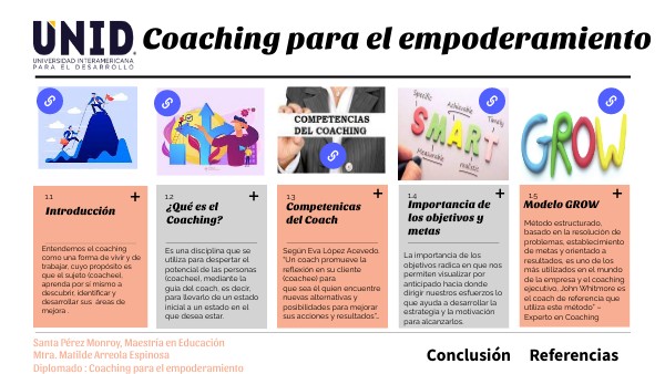 - Payeras, J. (2004). «Coaching» y liderazgo: para directivos interesados en incrementar sus resultados. Universidad de La Laguna. https://dialnet.unirioja.es/servlet/libro?codigo=249642 - Melanie Amaya. (2019, 8 marzo). LÍDER COACH 11 técnicas que puedes aplicar HOY [Vídeo]. YouTube. https://www.youtube.com/watch?v=w96ggoKM6t0- Zapata, M. S. (2012). ¿Qué es el coaching? sus orígenes, definición, distintas metodologías y principios básicos de actuación de un coach. 3C Empresa, 1(3), 3. https://dialnet.unirioja.es/descarga/articulo/4817930.pdf- Katia. (2021b, noviembre 10). Team - Allenati per l'Eccellenza. Allenati per l’Eccellenza. Recuperado 1 de septiembre de 2023, de https://www.allenatiperleccellenza.com/competenze-icf/?lang=es - A3coaching, A.-. (2014, 13 febrero). OBJETIVO SMART, EL ARTE DE FORMULAR OBJETIVOS - A3Coaching, coaching online y presencial. https://www.a3coaching.com/2014/02/objetivo-smart/ - MODELO SMART: ELEVANDO EL COACHING a OTRA DIMENSIÓN. (s. f.). NNPCOACHING «Apoyo tu proceso de cambio». https://www.nnpcoaching.com/modelo-smart-elevando-el-coaching-a-otra-dimension/ - Pedro García Sánchez. (2020, 24 noviembre). Modelo Grow en español 🌏 Técnicas de coaching y crecimiento personal [Vídeo]. YouTube. https://www.youtube.com/watch?v=VKT4qEFSt4o