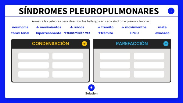 Arrastra las palabras para describir los hallazgos en cada síndrome pleuropulmonar.