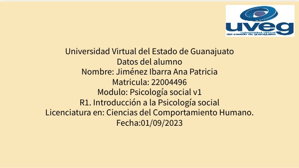 Universidad Virtual del Estado de Guanajuato Datos del alumno Nombre: Jiménez Ibarra Ana Patricia Matricula: 22004496 Modulo: Psicología social v1 R1. Introducción a la Psicología social Licenciatura en: Ciencias del Comportamiento Humano. Fecha:01/09/2023