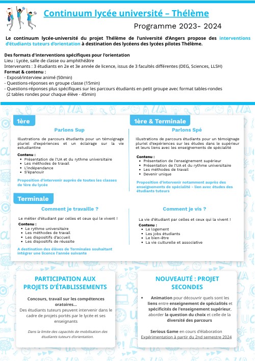 Le continuum lycée-université du projet Thélème de l’université d’Angers propose des interventions d’étudiants tuteurs d’orientation à destination des lycéens des lycées pilotes Thélème.