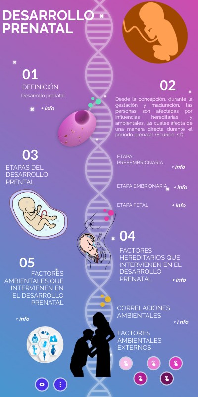 "El ambiente influye de manera considerable antes del nacimiento y posterior a este, es decir, los niños heredan determinadas capacidades mentales, mismas que se desarrollaran conforme a la influencia del ambiente en que se encuentre inmerso." (Armenta, s.f) Existen muchos factores externos que influyen en el desarrollo en la etapa prenatal.