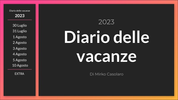 Questo è un giorno EXTRA perchè la settimana di diario delle vacanze è finita. Ma visto che questo è sia l'ultimo giorno delle vacanze e sia perchè andremo a visitare Roma e Pisa. Per prima cosa abbiamo caricato le valige visto che ce ne stavamo andando poi siamo partiti con la macchina per visitare CINECITTÀ appena arrivati abbiamo visto la casa di GRANDE FRATELLO VIP, per fortuna non lo stavano facendo perchè mi sta in testa. Subito dopo siamo andati a vedere dall'esterno cinecittà word il 1° parco divertimenti di roma subito dopo siamo andati a vedere il mare, era roccioso e molto profondo. Ed a questo punto si parte per ritornare a casa quindi facciamo una tappa a pisa per fisitare la torre di pisa. abbaimo fatto molte foto di qui una che sostenevo la torre. subito dopo siamo andati a prendere una calamita per mia nonna e una per noi. subito dopo volevamo prendere una bottiglia di vino per un amico soltanto che non ne abbiamo trovate. visto che si erano fatte le 7:30 quindi abbiamo cercato una pizzeria anche per celiaci e abbiamo preso una pizza per tutti quanti, io la classica margherita con la mozzarela tagliara a forma rotonda invece mio padre si è preso una pizza con la salsiccia, mia madre con il prosciutto invece mio fratello e mia sorella hanno preso quella con i Würstel. Finita questa serata e questa bellissima vacanza siamo partiti per ritornare a casa vera e propria quindi ci siamo avviati. siamo arrivati a casa all'una e mezza di notte. questa e stata la mia vacanza preferita perchè abbiamo visto pocchissimo il mare ma abbiamo visitato tante città diverse.
