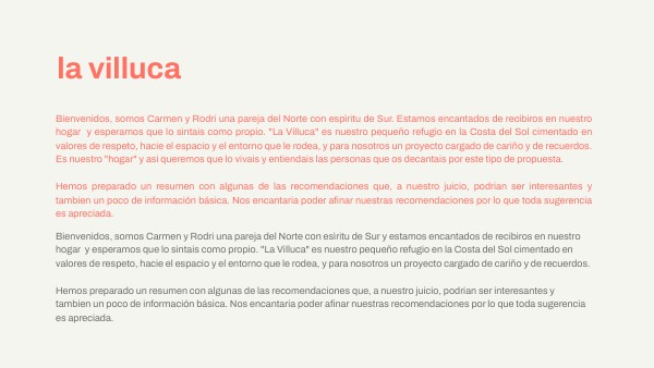 Bienvenidos, somos Carmen y Rodri una pareja del Norte con esìritu de Sur y estamos encantados de recibiros en nuestro hogar y esperamos que lo sintais como propio. "La Villuca" es nuestro pequeño refugio en la Costa del Sol cimentado en valores de respeto, hacie el espacio y el entorno que le rodea, y para nosotros un proyecto cargado de cariño y de recuerdos. Hemos preparado un resumen con algunas de las recomendaciones que, a nuestro juicio, podrian ser interesantes y tambien un poco de información básica. Nos encantaria poder afinar nuestras recomendaciones por lo que toda sugerencia es apreciada.