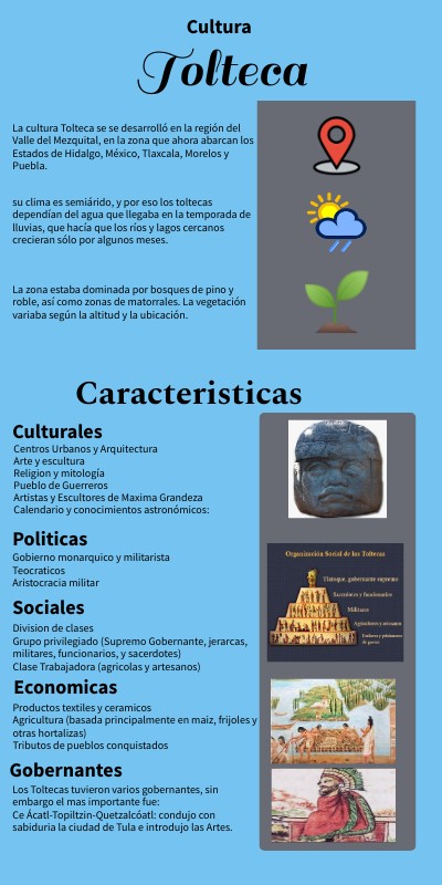 La cultura Tolteca se se desarrolló en la región del Valle del Mezquital, en la zona que ahora abarcan los Estados de Hidalgo, México, Tlaxcala, Morelos y Puebla.
