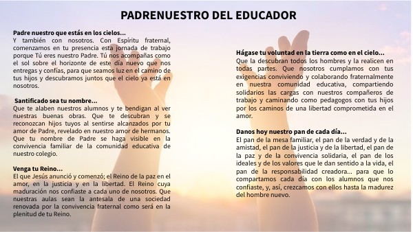 Hágase tu voluntad en la tierra como en el cielo... Que la descubran todos los hombres y la realicen en todas partes. Que nosotros cumplamos con tus exigencias conviviendo y colaborando fraternalmente en nuestra comunidad educativa, compartiendo solidarios las cargas con nuestros compañeros de trabajo y caminando como pedagogos con tus hijos por los caminos de una libertad comprometida en el amor. Danos hoy nuestro pan de cada día... El pan de la mesa familiar, el pan de la verdad y de la amistad, el pan de la justicia y de la libertad, el pan de la paz y de la convivencia solidaria, el pan de los ideales y de los valores que le dan sentido a la vida, el pan de la responsabilidad creadora... para que lo compartamos cada día con los alumnos que nos confiaste, y, así, crezcamos con ellos hasta la madurez del hombre nuevo.